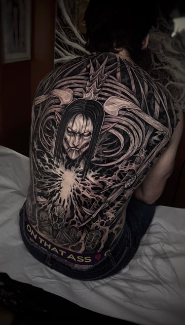 "I'm originally from Colombia, but I've lived in Madrid half of my life. I moved to Finland in 2023. I've been tattooing professionally since 2017 and developed my style 3 years ago. I have always loved drawing dark and creepy things. I never want to stop learning more and try to make each design as personal as possible. I enjoy the creative process of the tattoo and I want my clients to leave with a tattoo that flows with the body and fits their personality."